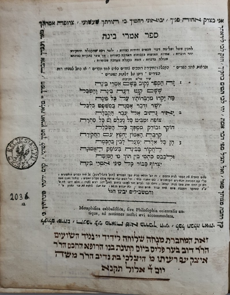 Das vor uns liegende Buch ist ein gutes Beispiel dafür, wie verfänglich eine Titelseite sein kann. Es gibt keine Informationen über den Verlag, den Drucker oder den Ort der Veröffentlichung. Ausserdem wird das Buch beschrieben, als aus einer alten Bibliothek stammend und dass darin „Haskamot“ ( Zustimmungen/ Imprimatur) von alten angesehenen „Geonim“ (Genies) enthalten sind. Der Autor des Buches bleibt ein Rätsel und wird nur durch das Wort „Pil’i“ (wunderbar, rätselhaft) erwähnt. Was uns bleibt, ist das Erscheinungsdatum, das in Gematrie auf das Jahr 1784 berechnet wird, und zwei sehr einzigartige Informationen: die erste eine Stempel aus einer unbekannten Quelle, die andere eine handschriftliche Widmung.