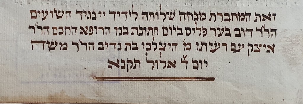 Die Widmung wurde in schöner Handschrift am Tag Dalet von Elul (ד‘ באלול) im Jahr (תקנ“א) 5551 geschrieben. Das ist der 3. September 1791. Der Empfänger ist Dov Beer Flies, „Führer der Adligen“, der Vater des Arztes Itzek Flies, aus Anlass des Hochzeitstages seines Sohnes mit der Tochter des „Nadiv“ Moshe.