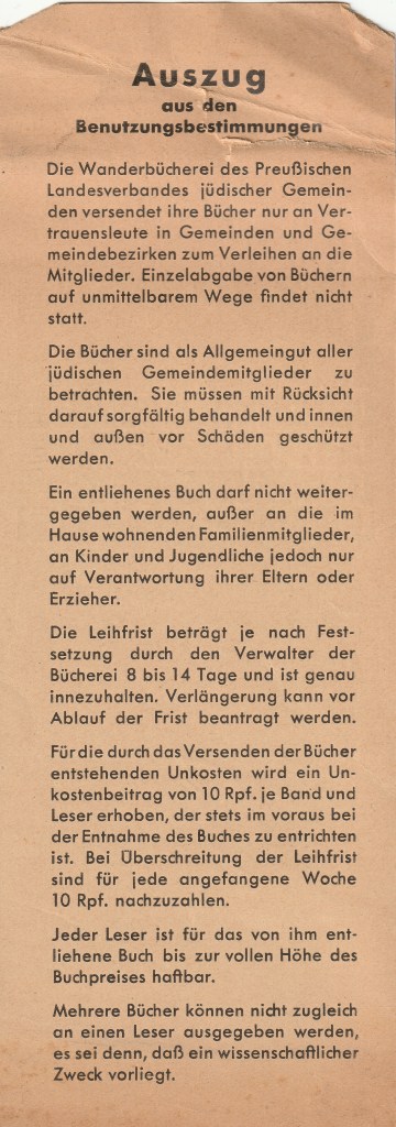 Dank des grossartigen Fundes unserer Leserin, der Wissenschaftlerin Mirjam Gutschow, können wir ein Bild dieses Lesezeichens präsentieren. Es wurde in einem Buch der Rosenthaliana Bibliothek in Amsterdam gefunden. Wie man sieht, trägt es auch das schöne Logo der Wanderbücherei und auf der Rückseite einen „Auszug aus den Benutzungsbestimmungen“ dieser einzigartigen Bibliothek.