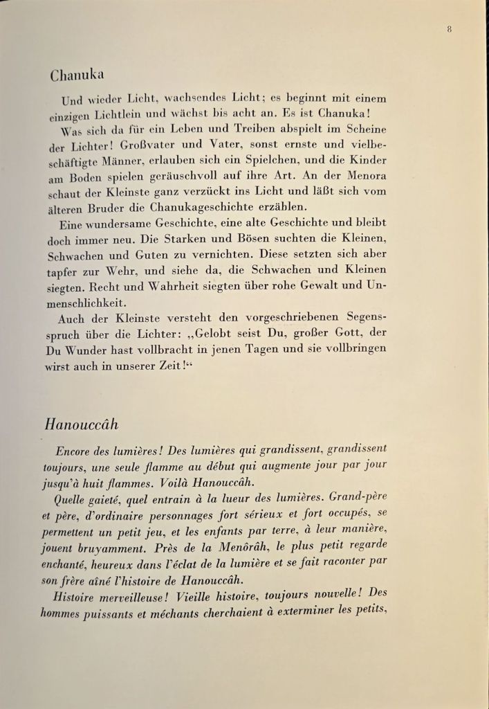 Liebes Kind, Dieses Mäppchen, das wir Dir schenken, enthält acht Abbildungen von Gemälden, die der jüdische Künstler Moritz Oppenheim vor bald hundert Jahren geschaffen hat. Ob du sie alle verstehen wirst? Der beigefügte Text soll Dir dabei helfen, und Dein Religionslehrer wird Dir auf alle Fragen gerne Antwort geben. An ihn, oder auch an uns direkt, kannst Du Dich immer wenden, wenn Du über unsere jüdische Religion etwas wissen willst. Sage deinen Pflegeeltern, dass wir ihnen für alles, was sie für Dich tun, herzlich danken. Frage sie, ob Du eines oder zwei der Bildchen über Deinem Bett aufhängen darfst. Mit vielen Chanuka-Wünschen grüsst dich der Verband Schweizerischer Jüdischer Flüchtlingshilfen. Chanuka 5706 Dezember 1944
