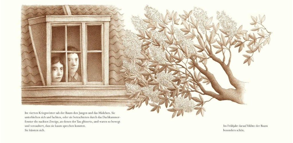 Ich stieg die steile Treppe hinauf. Als ich am Schlafzimmer der Franks vorbeikam, sah ich Anne allein am Fenster sitzen […] Anne saß an dem alten Küchentisch neben dem Fenster. Von ihrem Stuhl aus konnte sie auf den großen Kastanienbaum und die Grünanlagen blicken, ohne selber gesehen zu werden[…] Oben im Versteck zog mich Anne zum verhängten Fenster mit den inzwischen sehr schmutzigen Gardinen und zeigte mir jedes neue Grün an der großen Kastanie. Es war wirklich ein prachtvoller Baum, übersät mit prallen Knospen. Anne beobachtete genau, wie sie täglich dicker wurden und sich zu entfalten begannen.