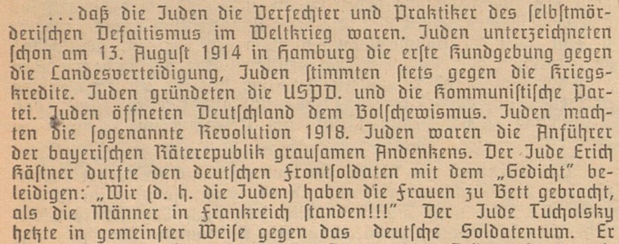 Zu den „jüdischen Eigenschaften“, die von Nazis und Antisemiten zugeschrieben wurden, gehörte auch das Bild des schwachen, ängstlichen und pazifistischen Juden, der den deutschen Kampfgeist angeblich schmälern wollte. Insbesondere in Kriegszeiten wurde den Juden vorgeworfen, durch ihre vermeintliche konspirative Kontrolle über die Presse, insbesondere die Feuilletons, Schwäche im „arischen“ Geist zu säen. Siegfried Jacobsohn, Gustav Landauer, Kurt Tucholsky, Ernst Toller, Walter Mehring und Alfred Kerr sind nur einige der Juden, denen dies ständig vorgeworfen wurde. Eine weitere Person, die in diesem Zusammenhang immer wieder genannt wurde, obwohl er kein Jude war, war Erich Kästner.
