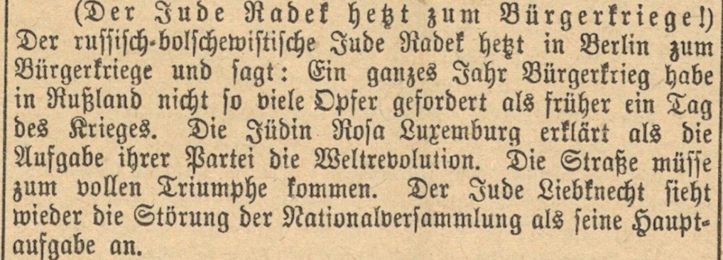 Daher ist es nicht verwunderlich, dass auch Karl Liebknecht, einer der prominentesten und beliebtesten sozialistischen Führer, der Judenheit bezichtigt wurde. Die Tatsache, dass er Genosse zweier weiterer sehr prominenter – jüdischer, sozialistischer Führer war – Karl Radek und Rosa Luxemburg, (mit der er schliesslich ebenfalls ermordet wurde) – verstärkte diese Anschuldigung nur noch. Oben ist ein Artikel aus den Mühlviertler Nachrichten vom 11. Januar 1919 zu sehen. In dem Artikel wird Liebknecht als „der Jude Liebknecht“ bezeichnet. Nur fünf Tage später wurden Luxemburg und Liebknecht ermordet.